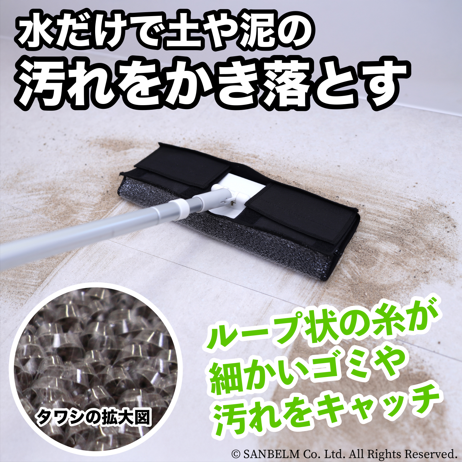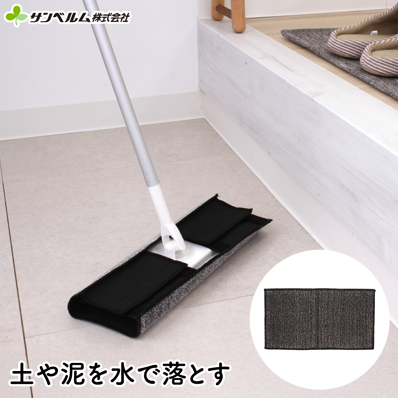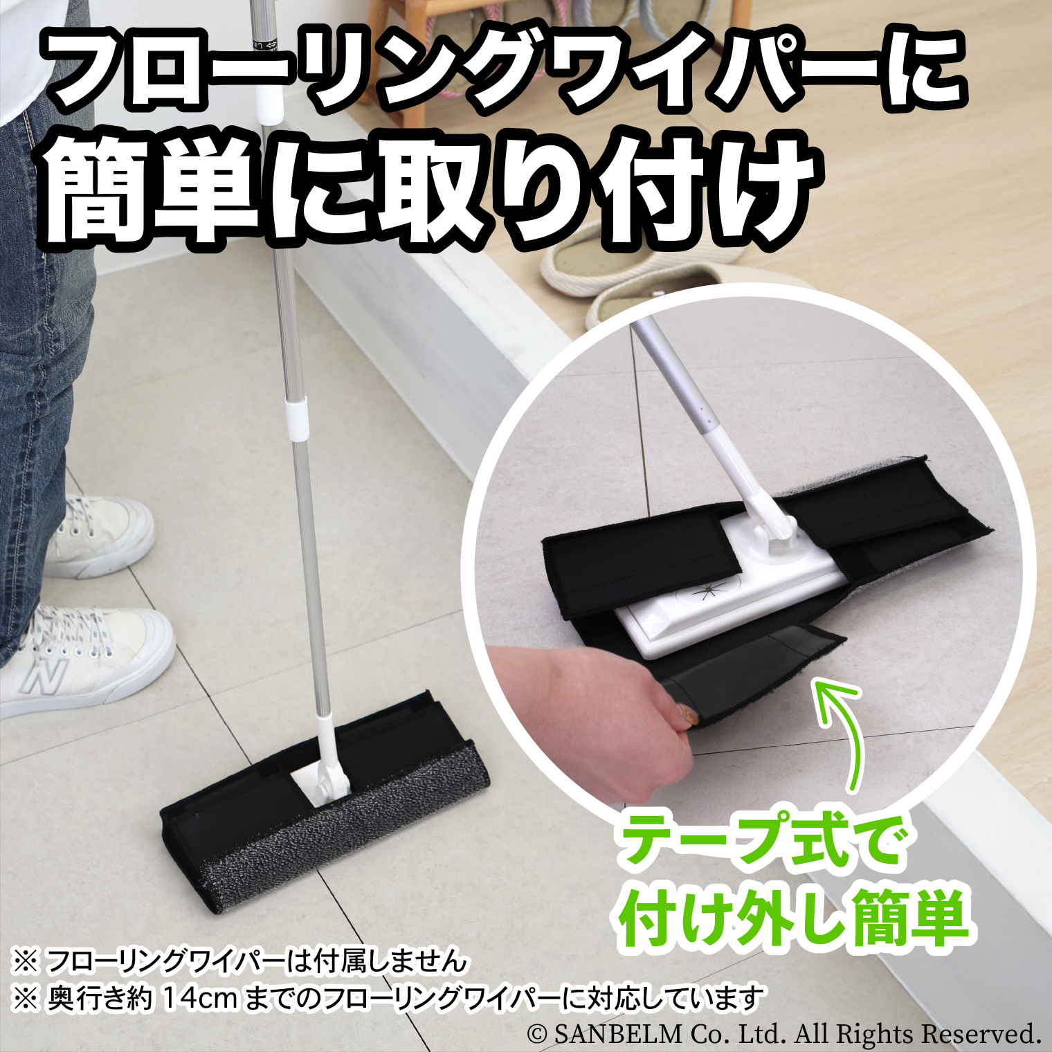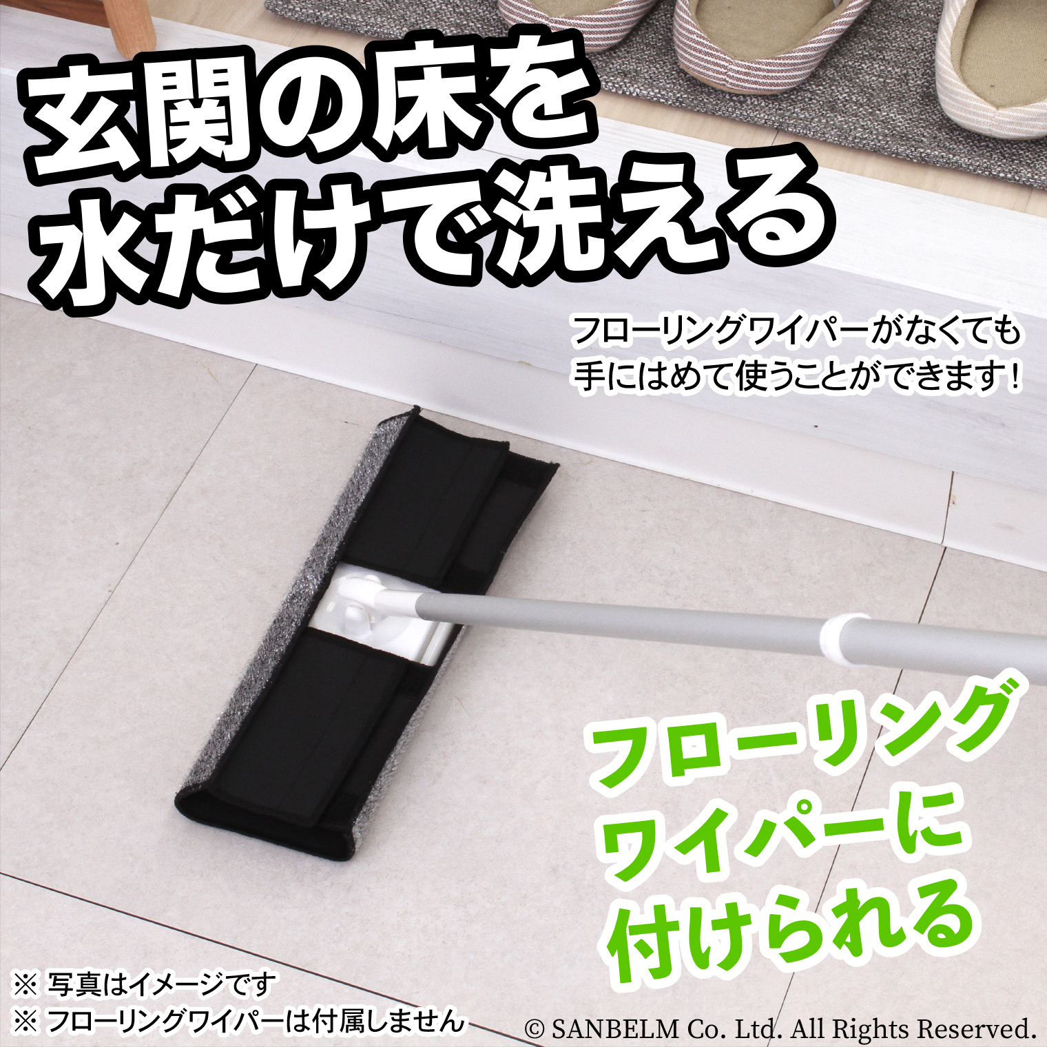 お手持ちのフローリングワイパーが玄関洗いタワシに早変わり。ループ上の意図が水だけで汚れを落とします。ワイパーに取り付ければ玄関の頑固な汚れもキレイにお掃除できます。吊りヒモ付きで収納が少ない玄関に便利です。フローリングワイパーの幅に合わせて留め方を調節できます。