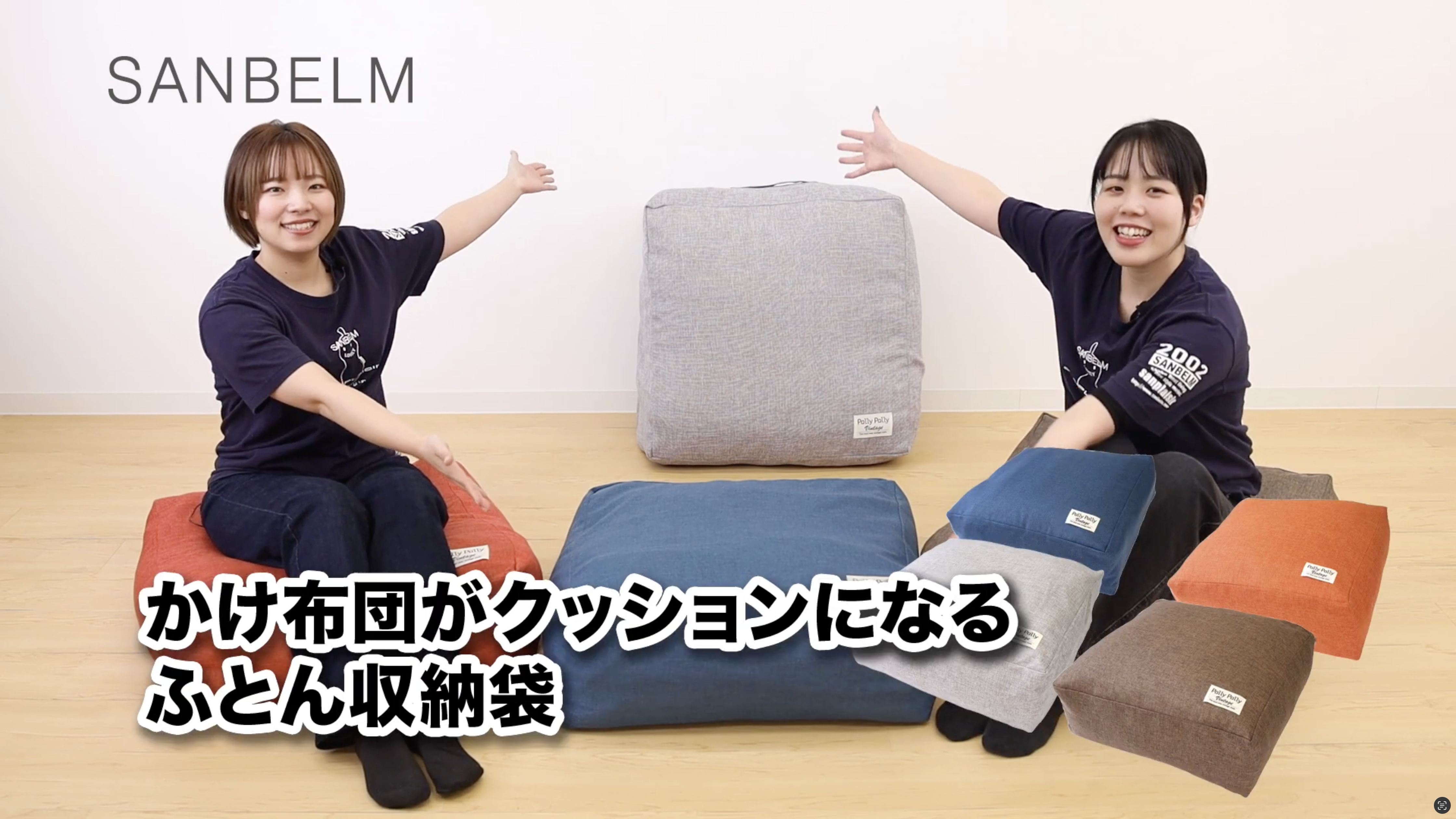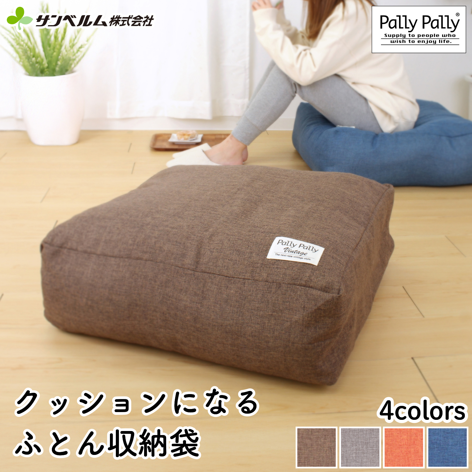 かけ布団や冬物の衣類などの収納場所に困らない、クッションになるふとん収納袋です。収納する量によって厚さや硬さを自由に調節して、お好みのクッションに。