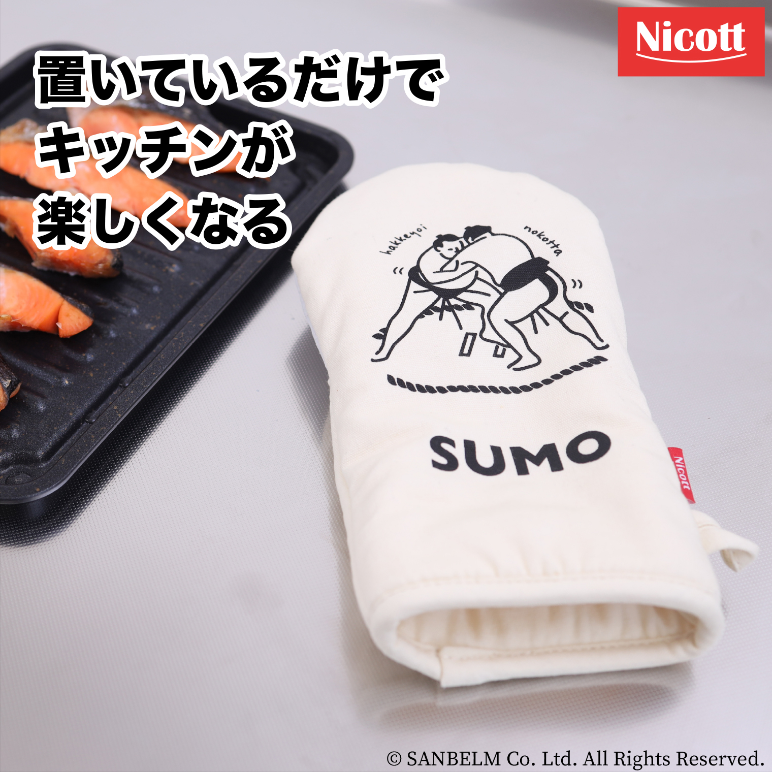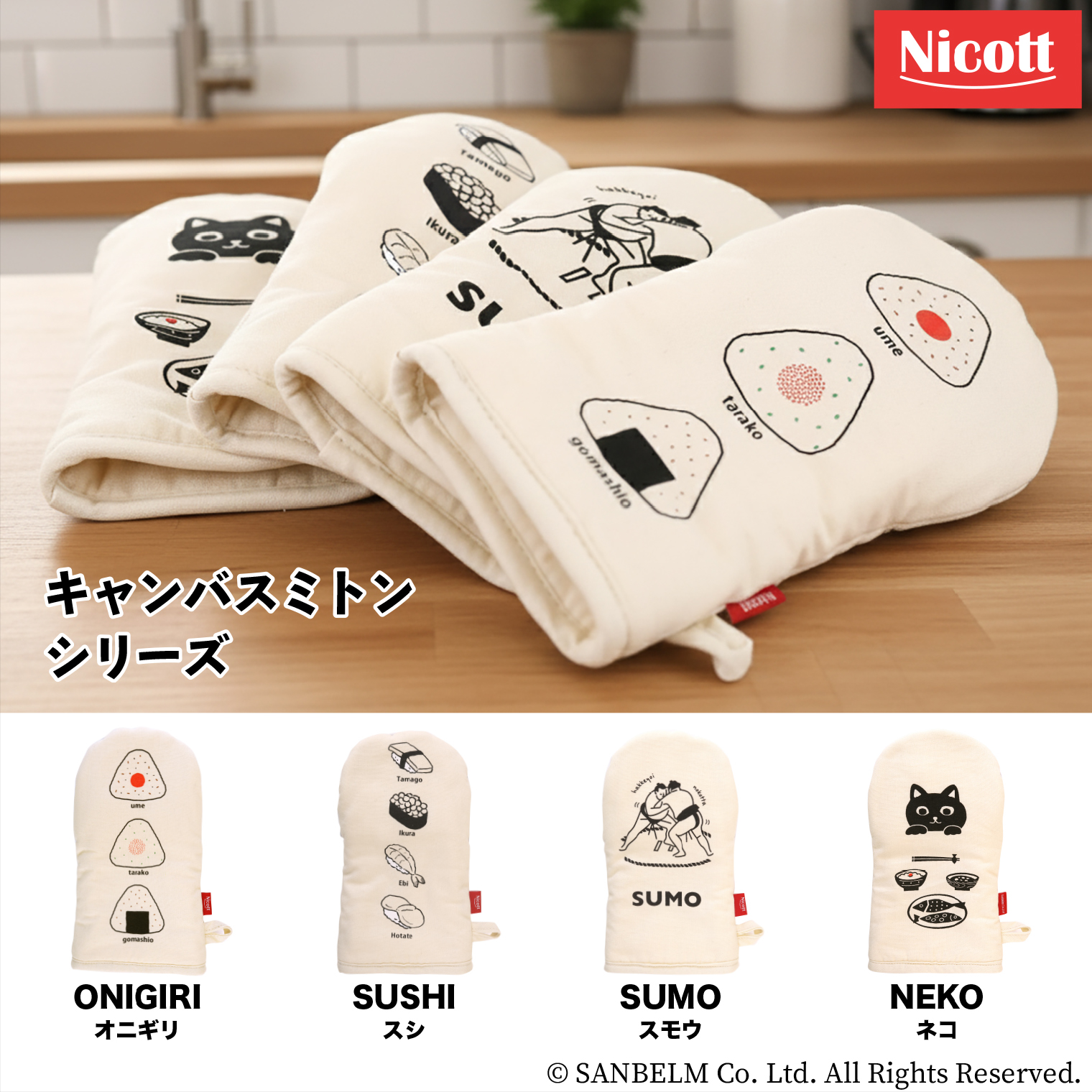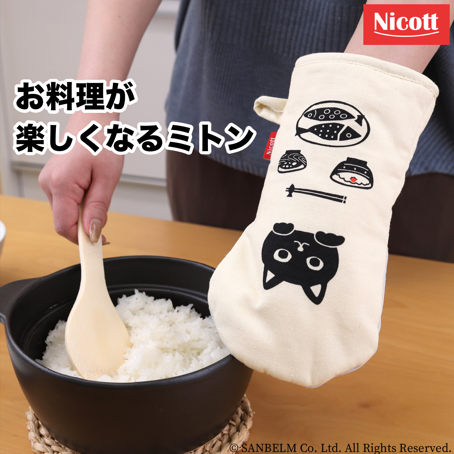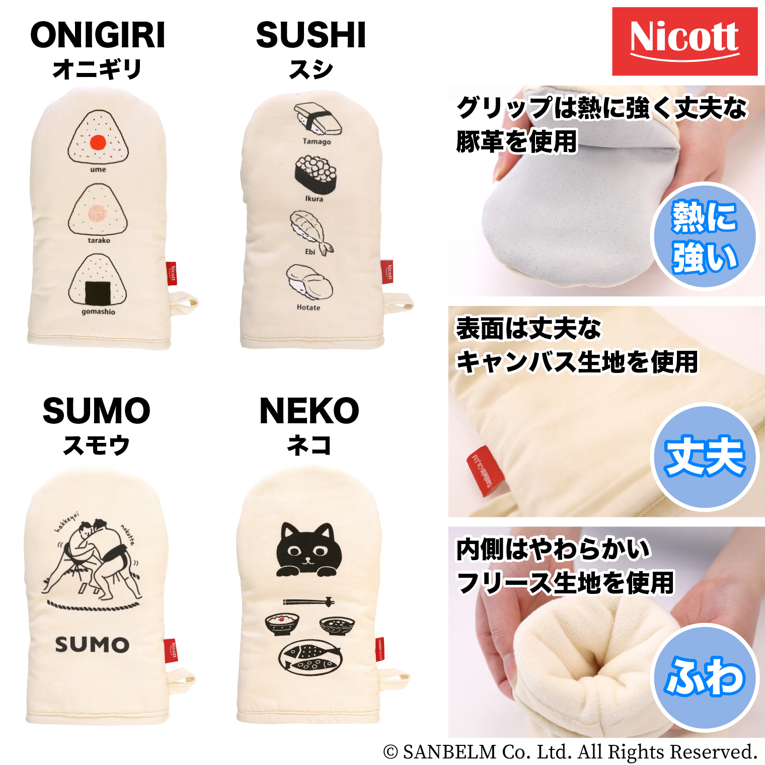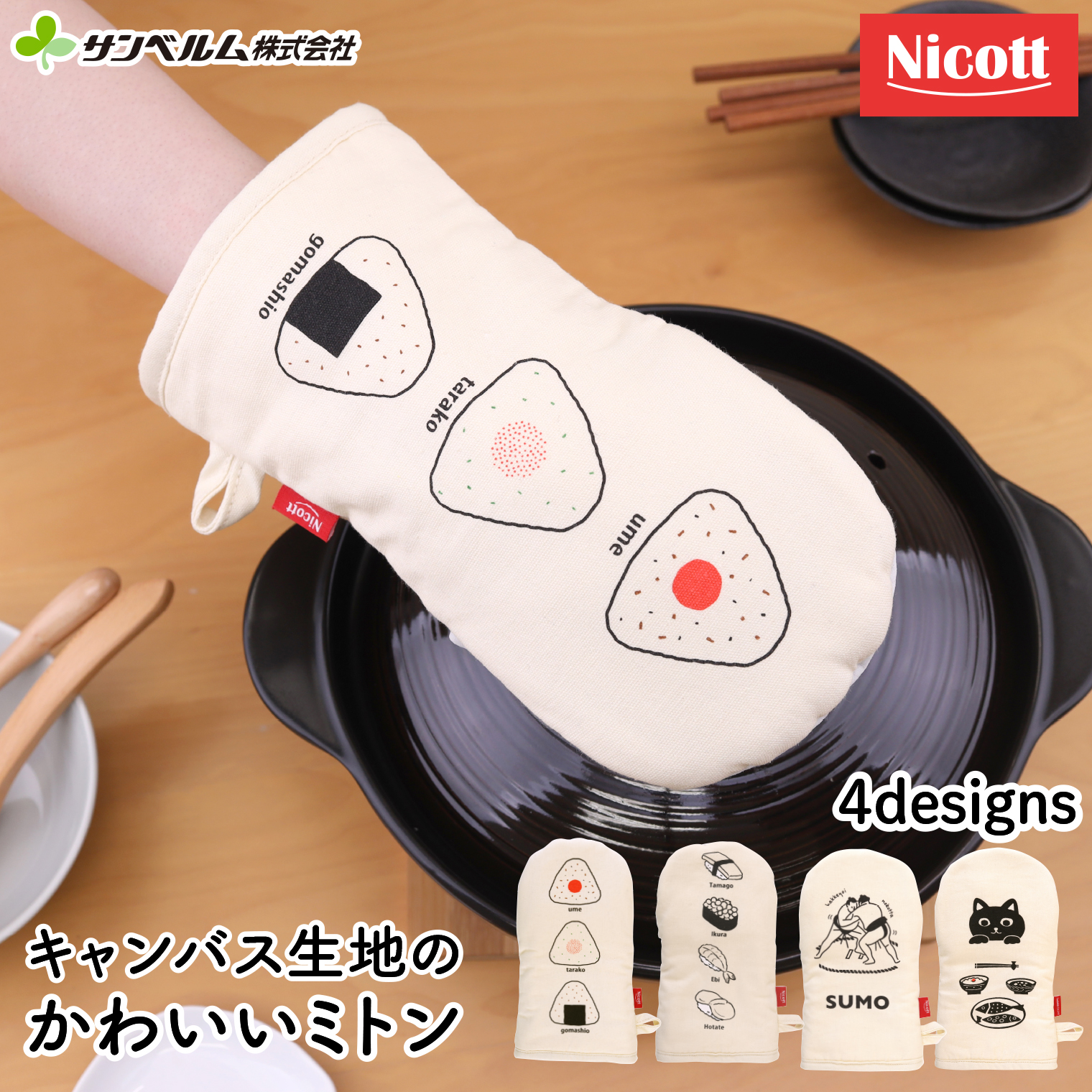 日本らしさのあるデザインがかわいいキャンバス生地のミトンです。掴む部分の生地には豚革を使用しており、熱に強く丈夫で安心。