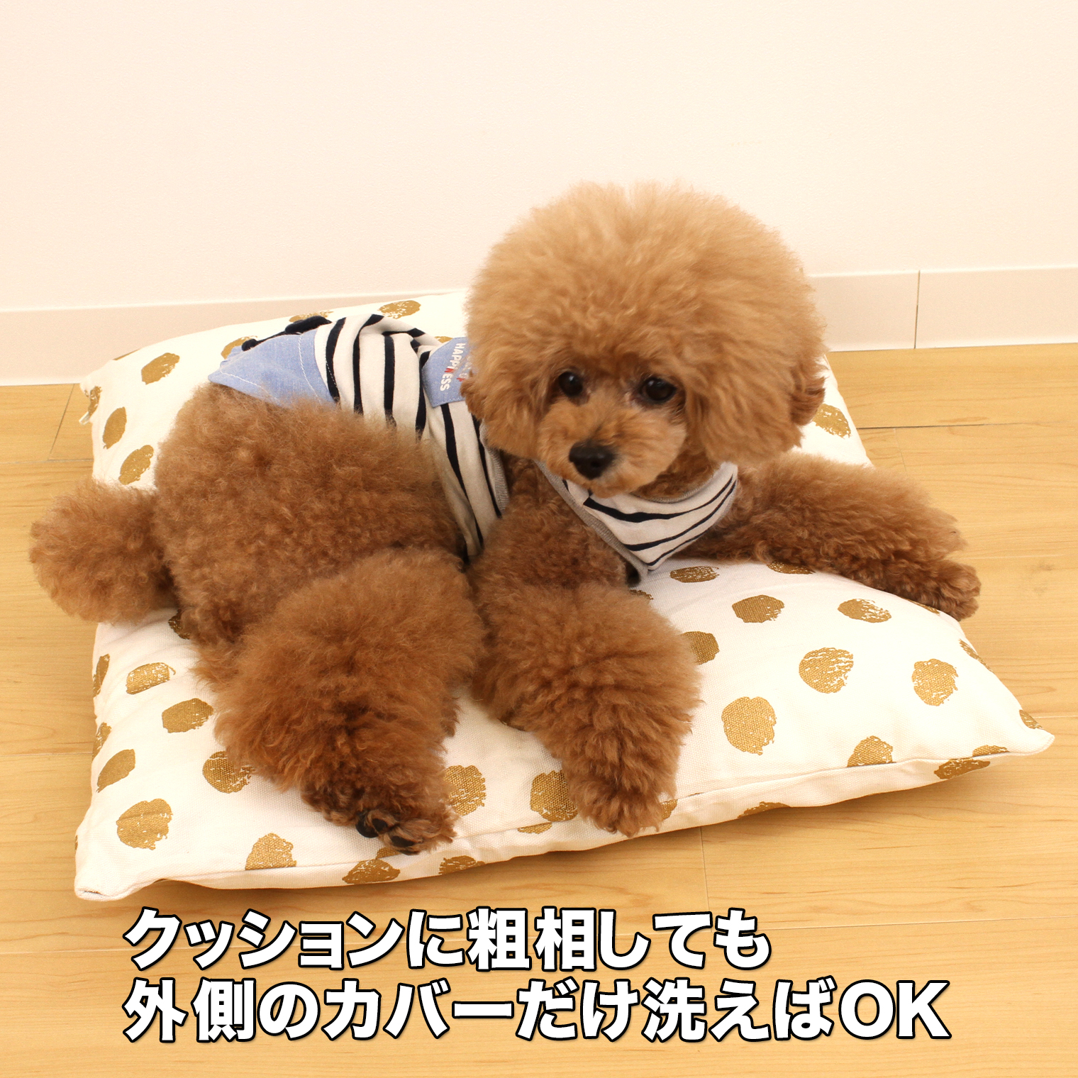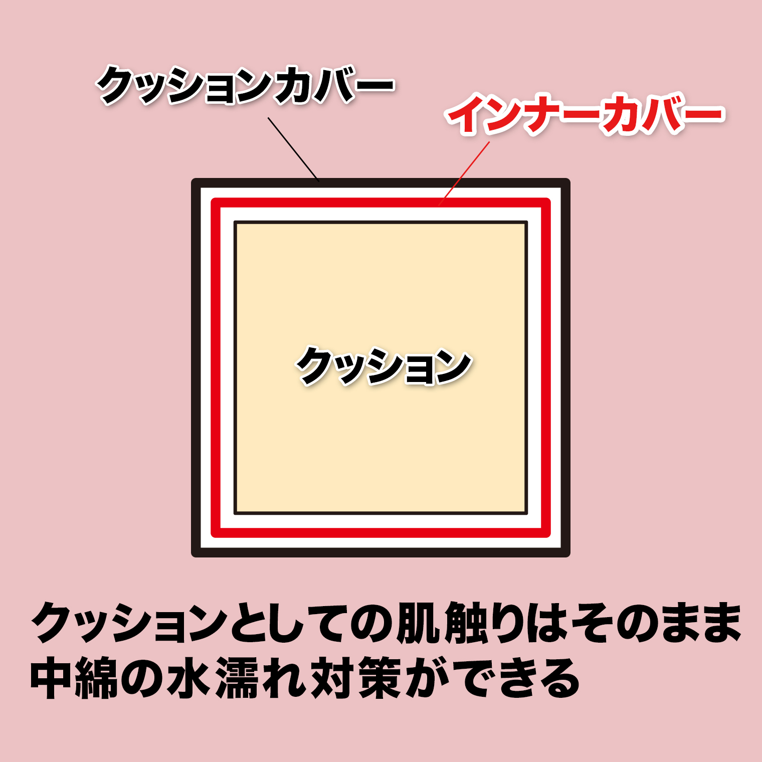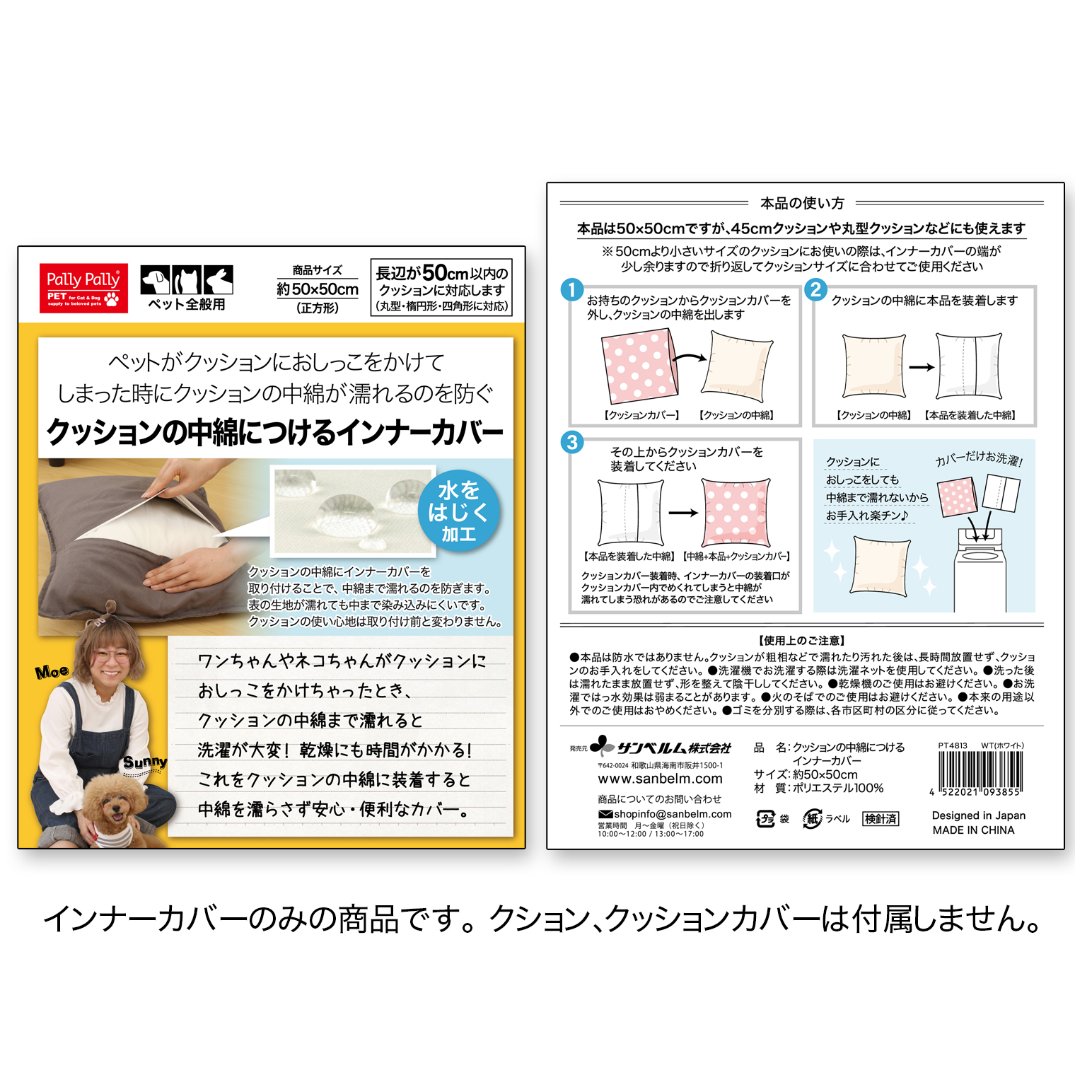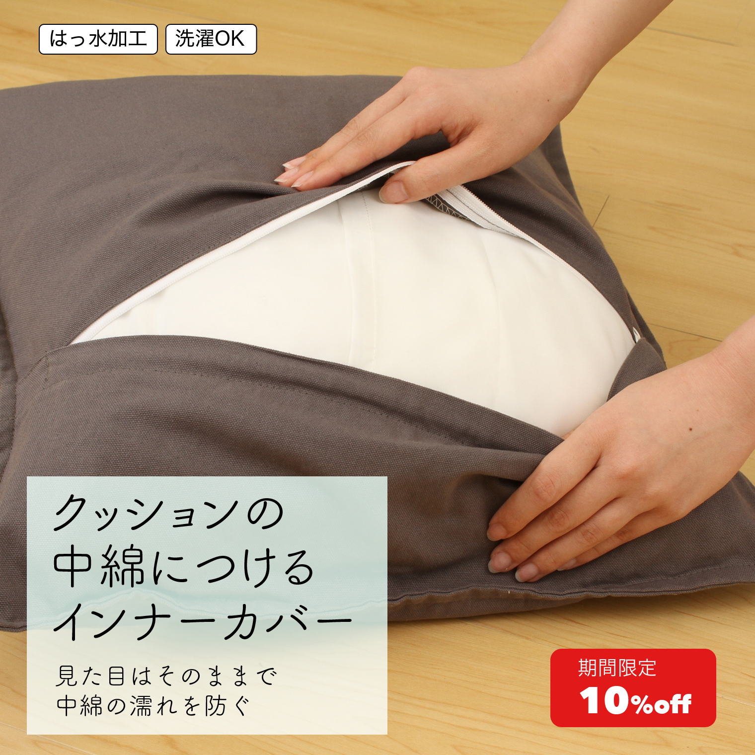ペットのおしっこがクッションの中綿まで浸透するのを防ぐ、はっ水加工のクッション用インナーカバーです。汚れても、クッションカバーとインナーカバーを洗うだけだからお手入れ簡単。