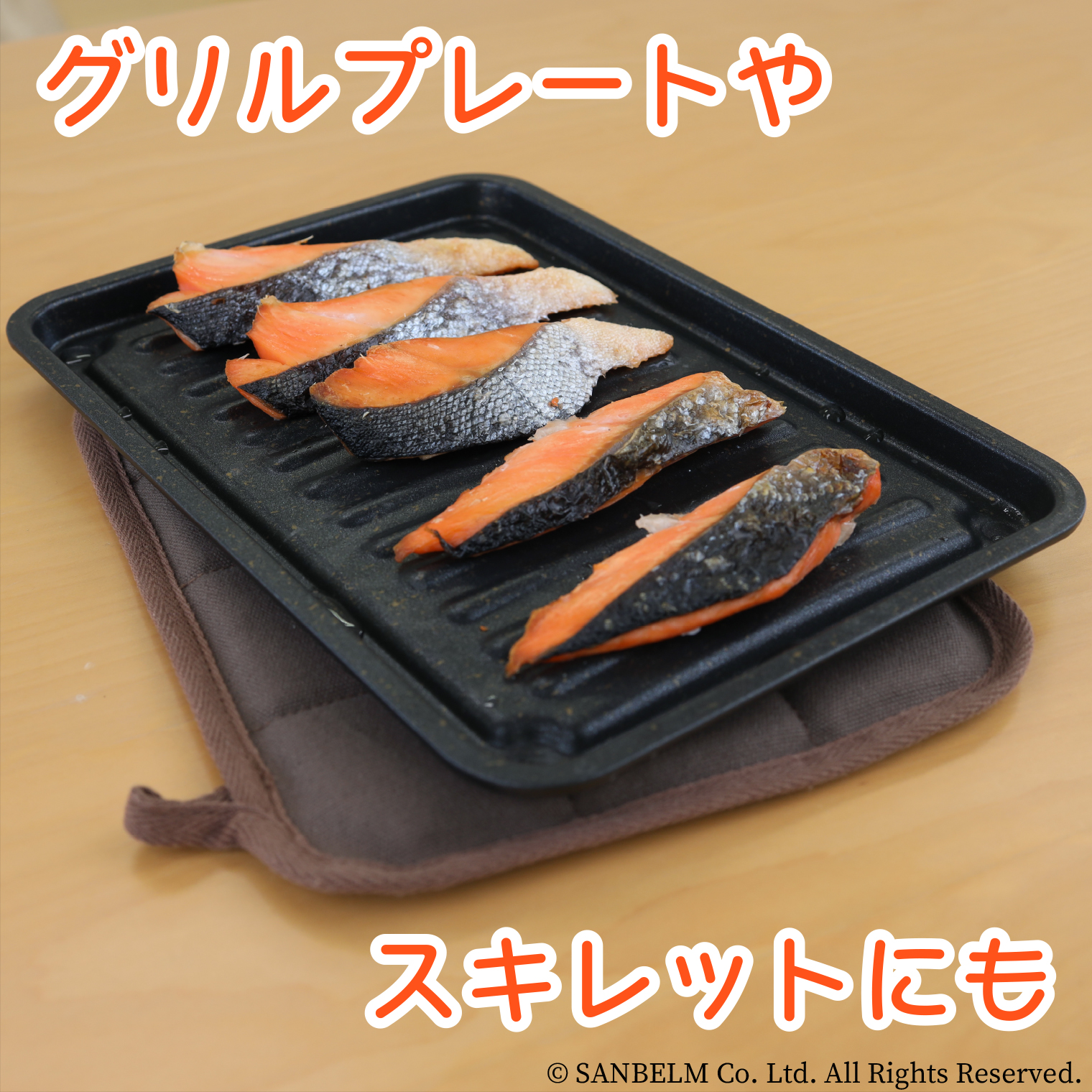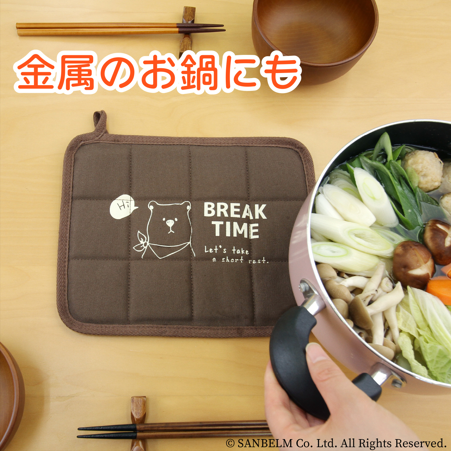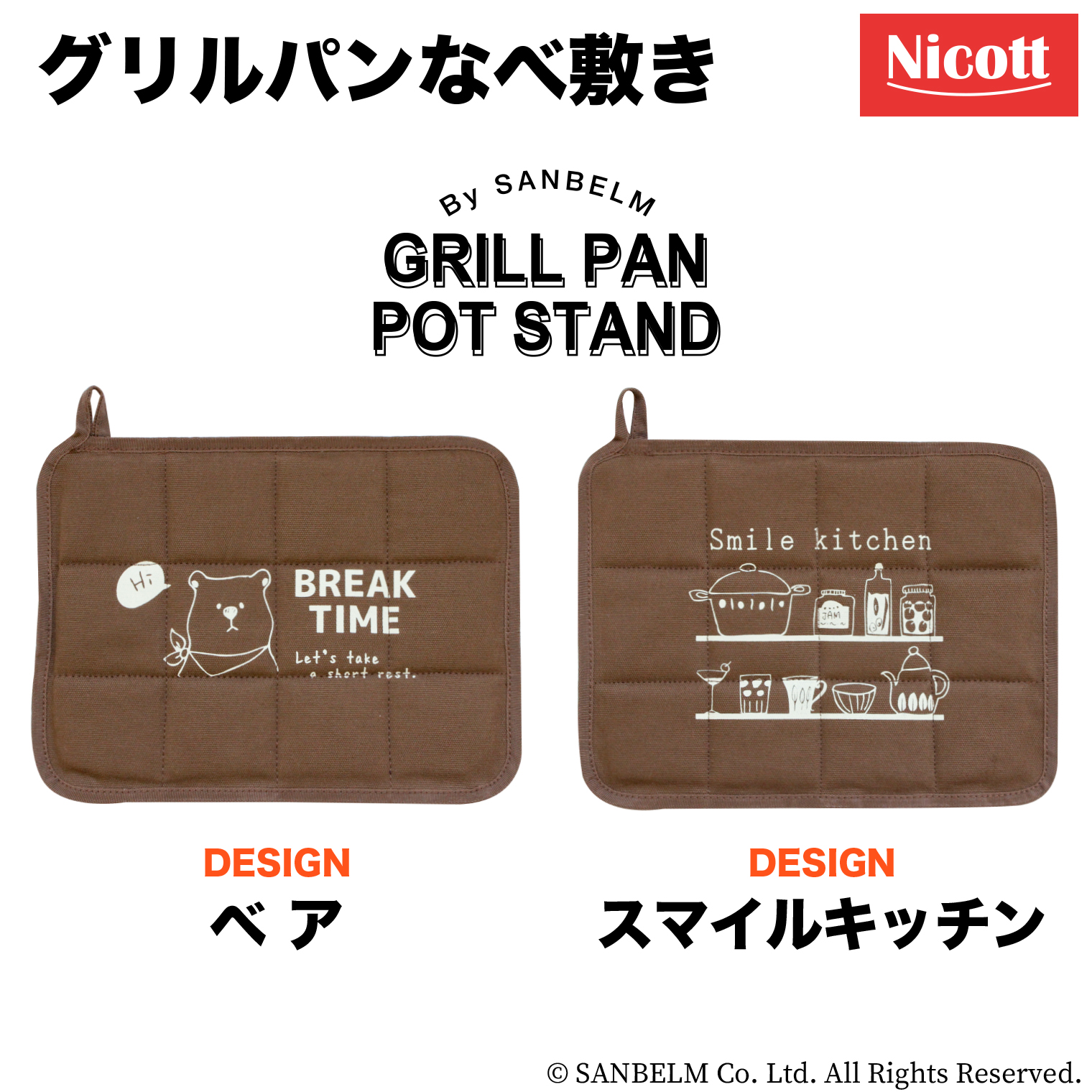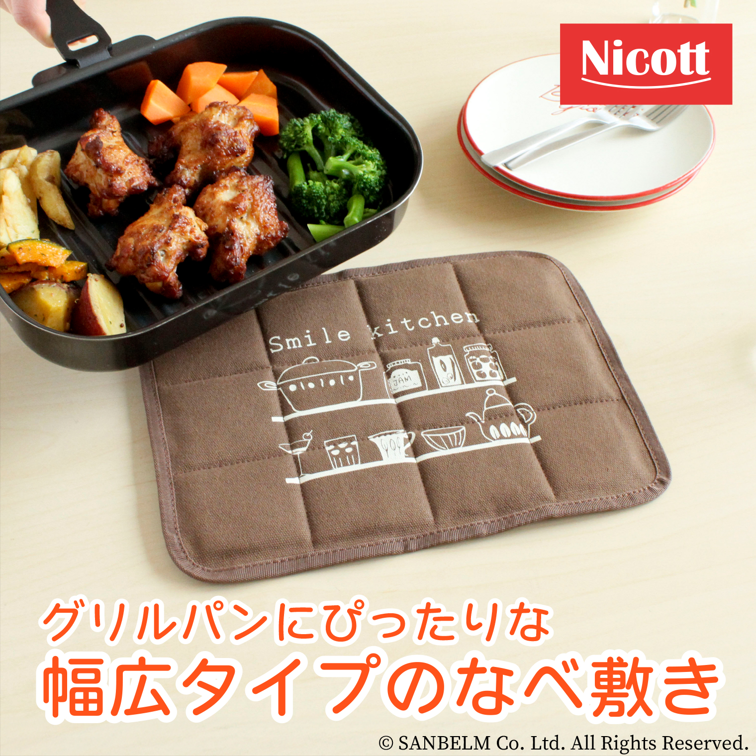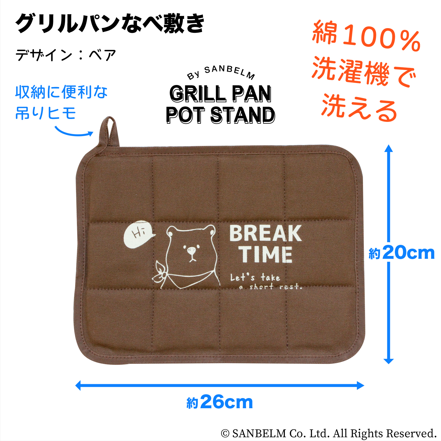 しっかり厚手だから熱くならない幅広タイプのグリルパン用なべ敷きです。洗濯機で丸洗いOK。吊りヒモ付きだから収納にも困りません。