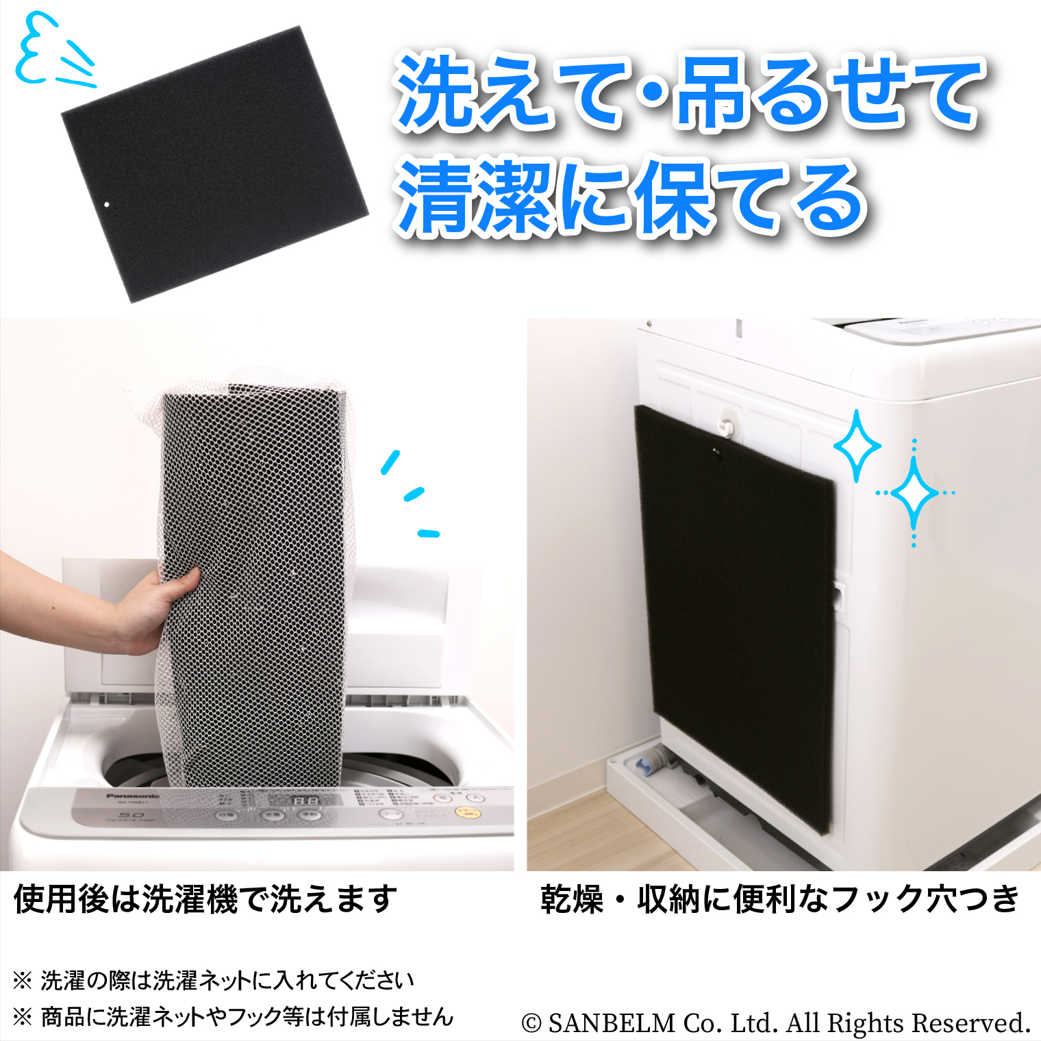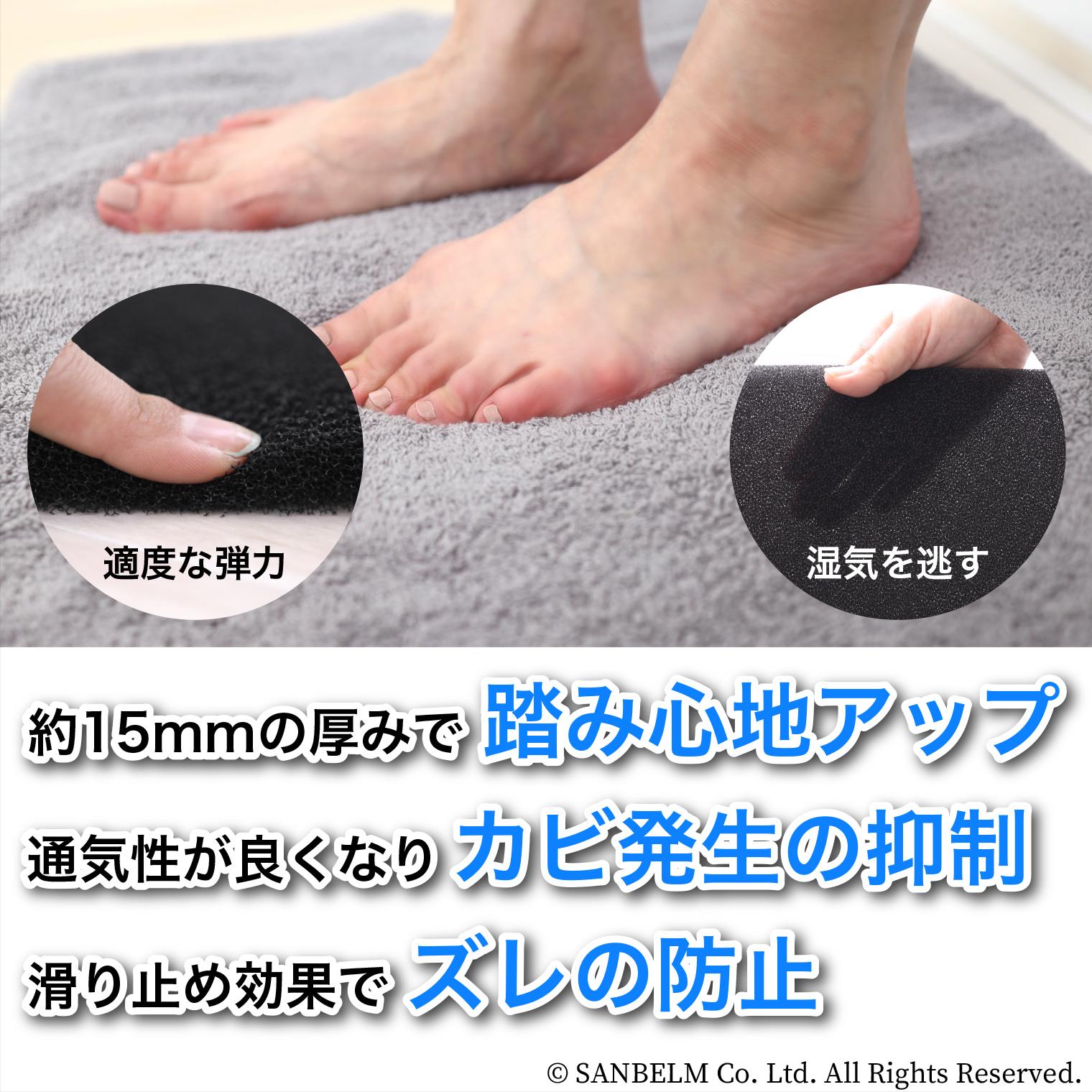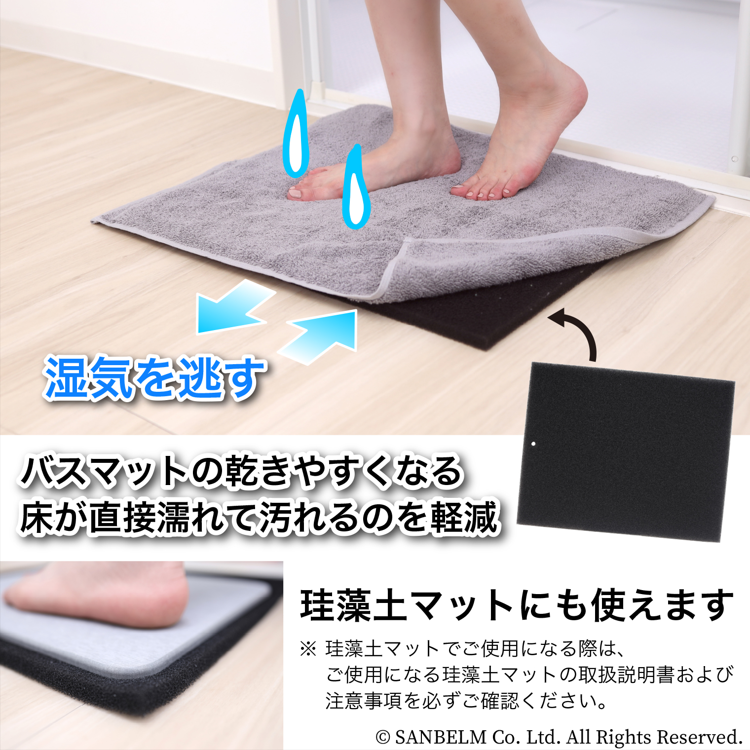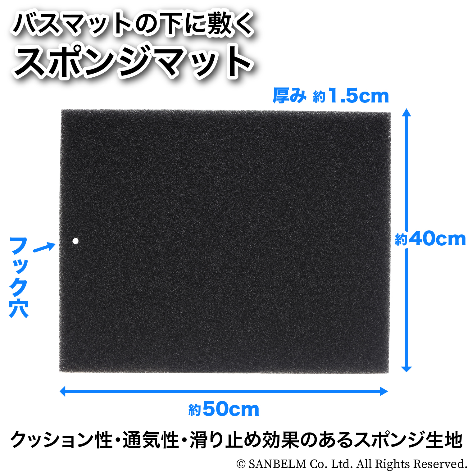 バスマットの乾きを早くし、踏み心地が最高になるスポンジマット。湿気を逃す通気性の良い生地。洗濯機で丸洗いできてお手入れ簡単。フックにかけて収納できて邪魔にならない。
