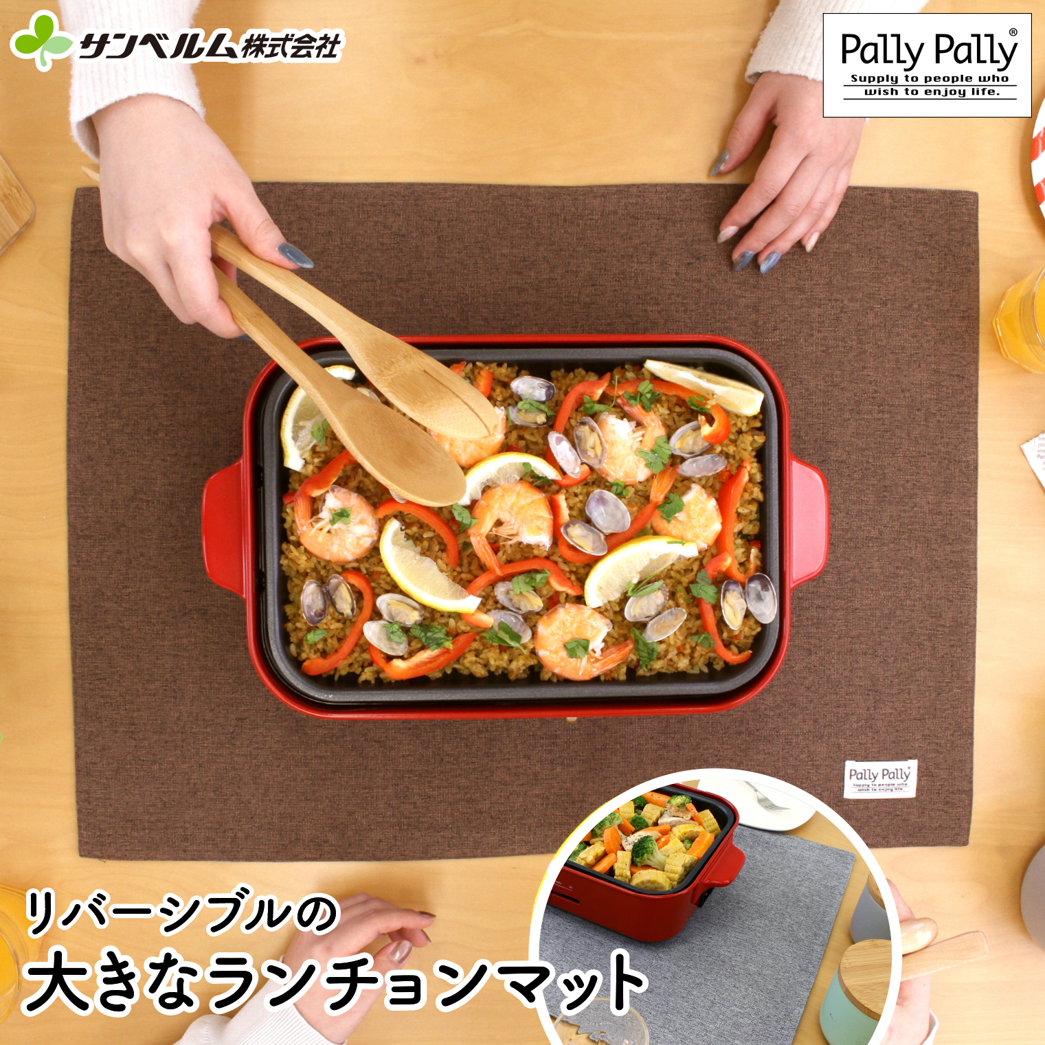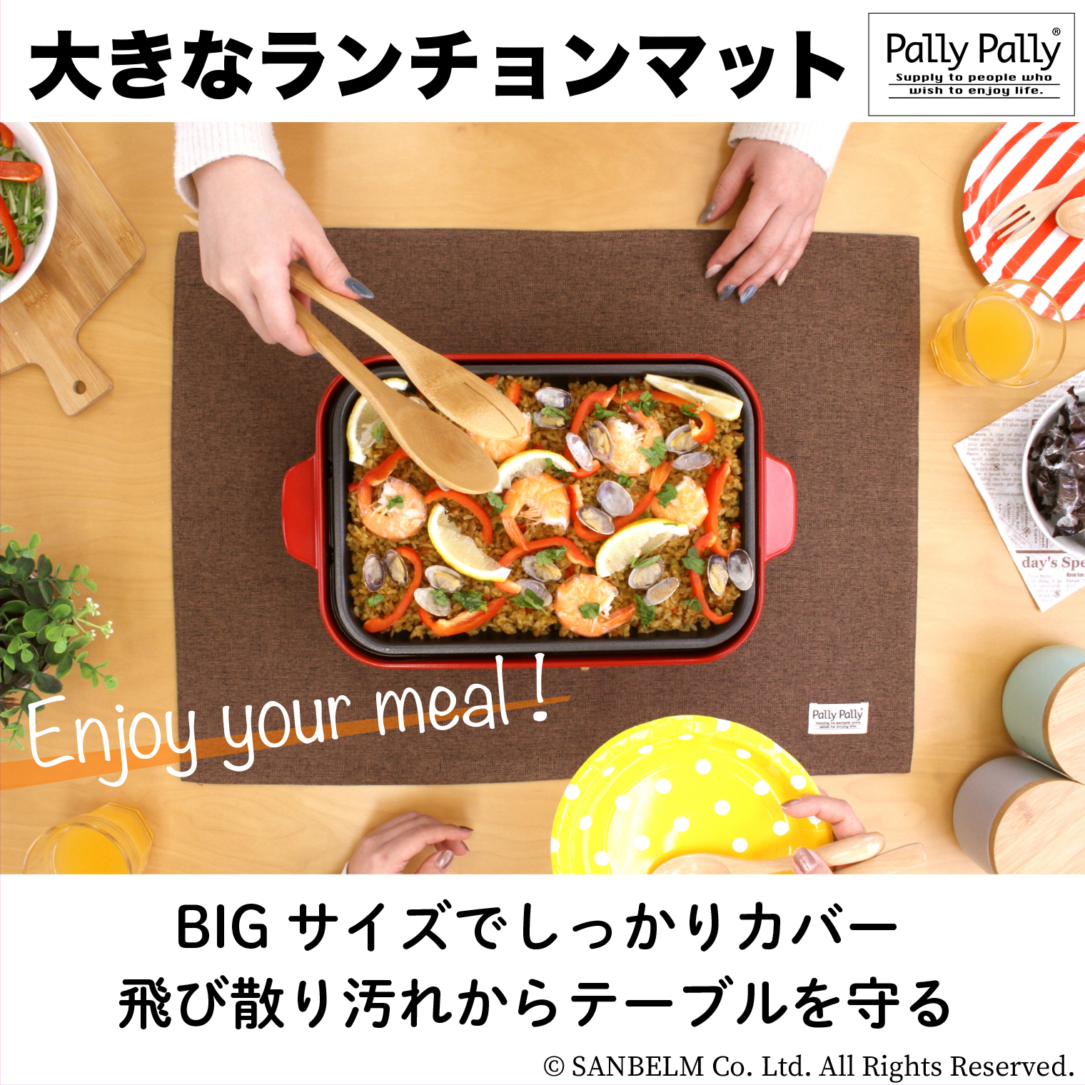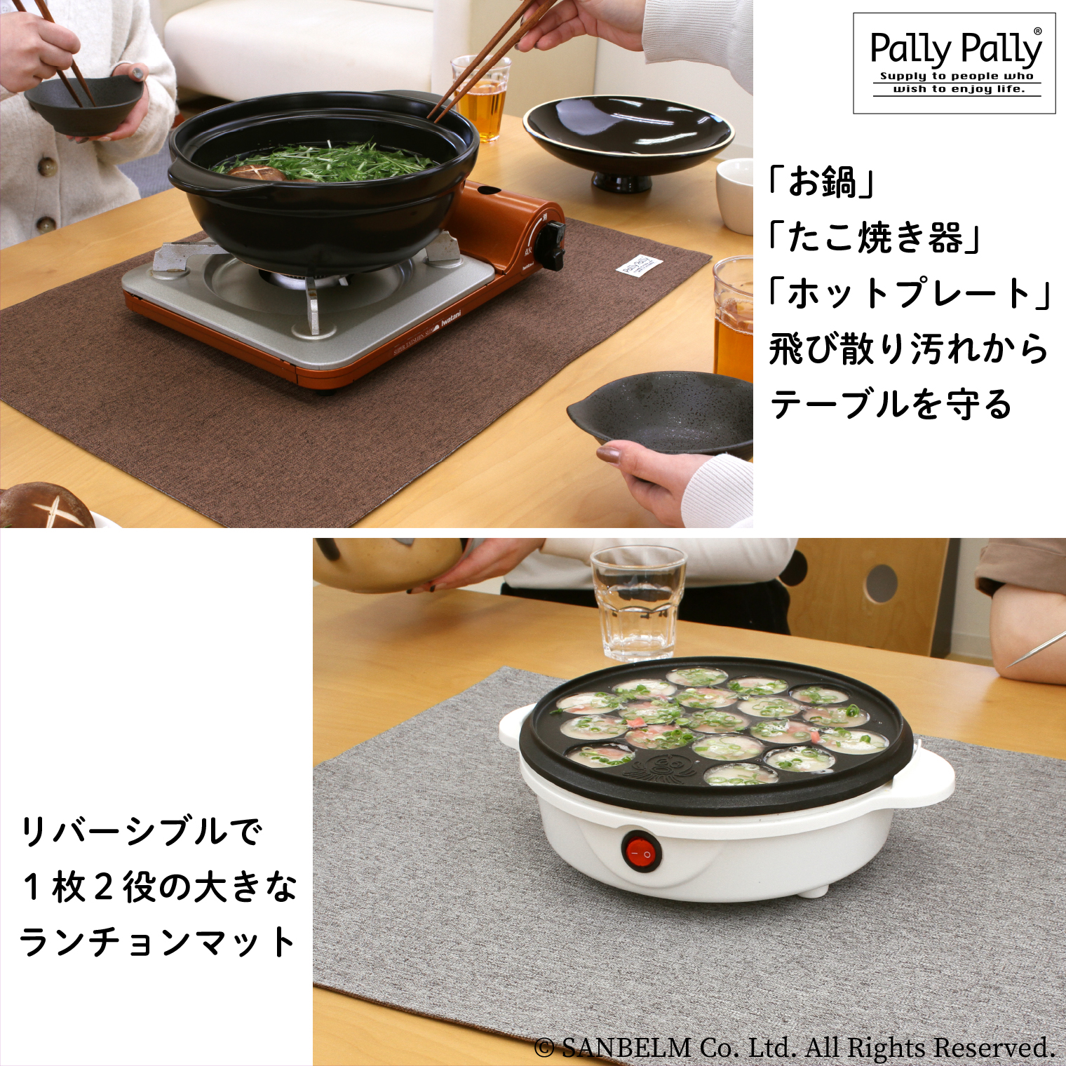 両面はっ水加工で、鍋やホットプレートなどが置ける大きめサイズのランチョンマットです。リバーシブルだから料理や気分で使い分けができ、飛び散り汚れからテーブルをしっかり守ります。洗濯機で丸洗いOK。布製だから畳んで省スペースで収納可能。