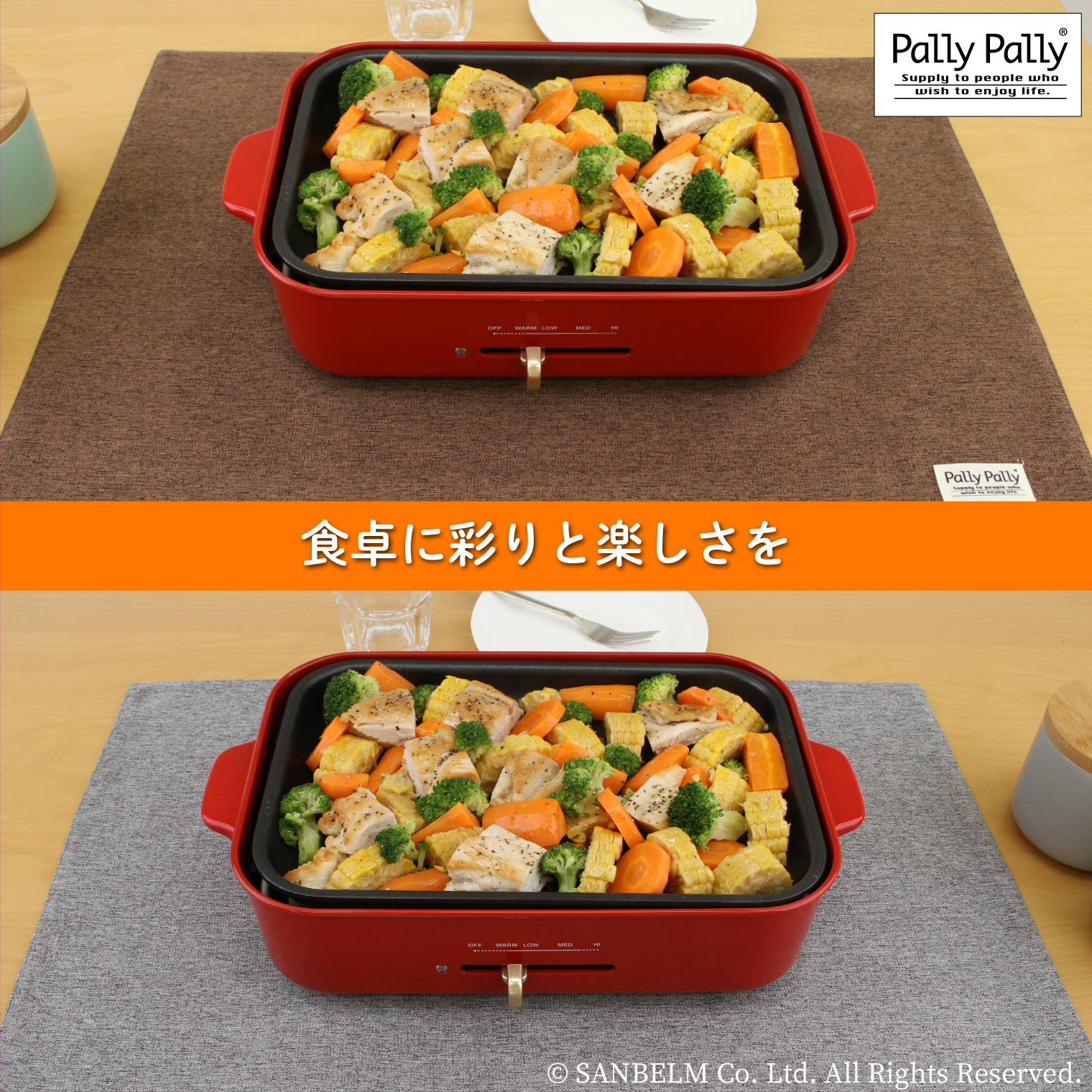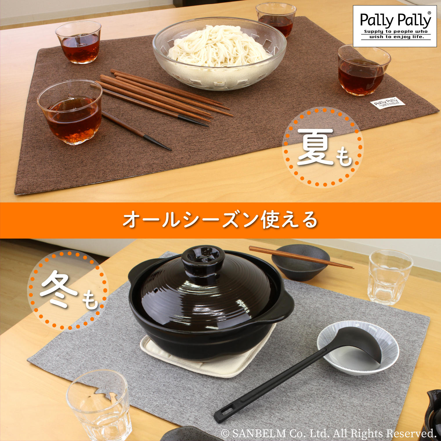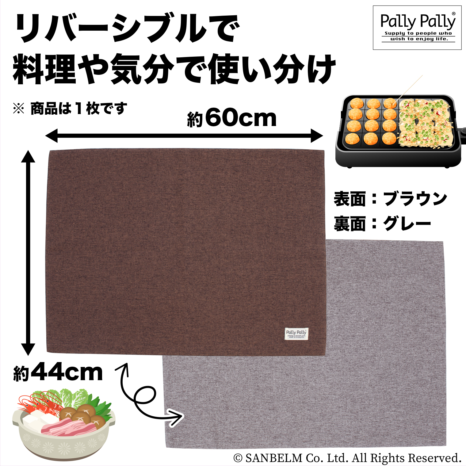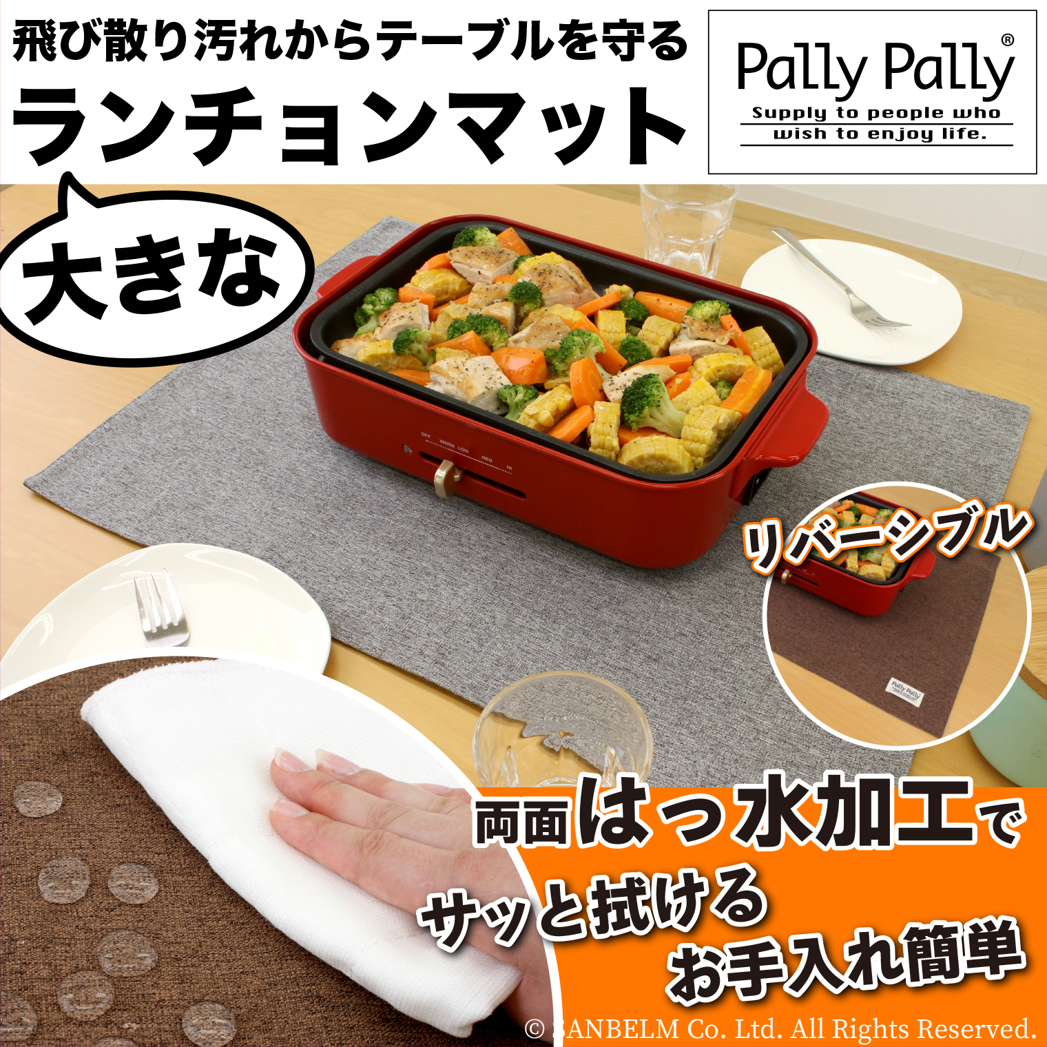 両面はっ水加工で、鍋やホットプレートなどが置ける大きめサイズのランチョンマットです。リバーシブルだから料理や気分で使い分けができ、飛び散り汚れからテーブルをしっかり守ります。洗濯機で丸洗いOK。布製だから畳んで省スペースで収納可能。