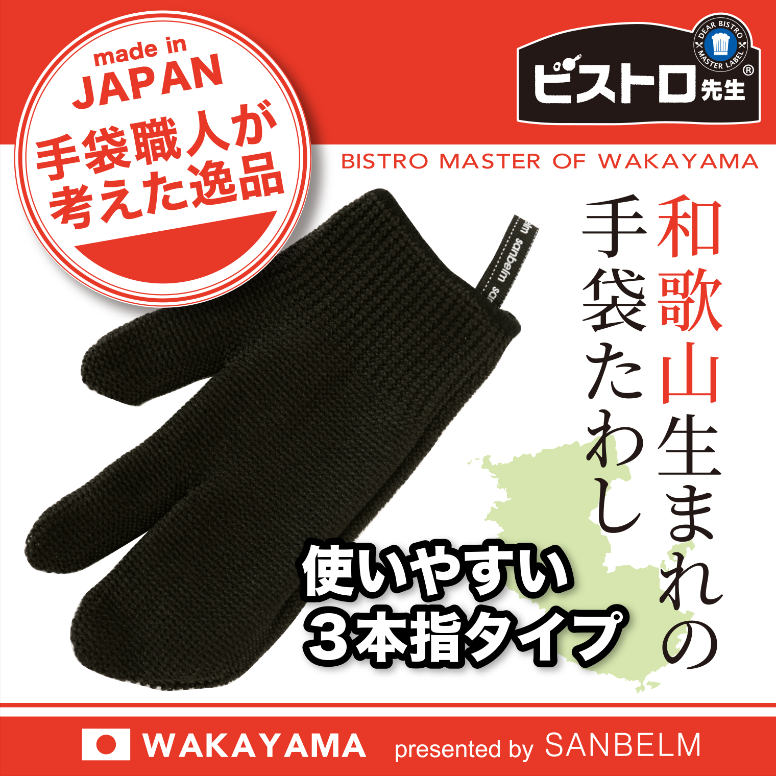 サンベルムのビストロ先生「和歌山生まれの手袋たわし」は手にはめて使う手袋型のタワシ。