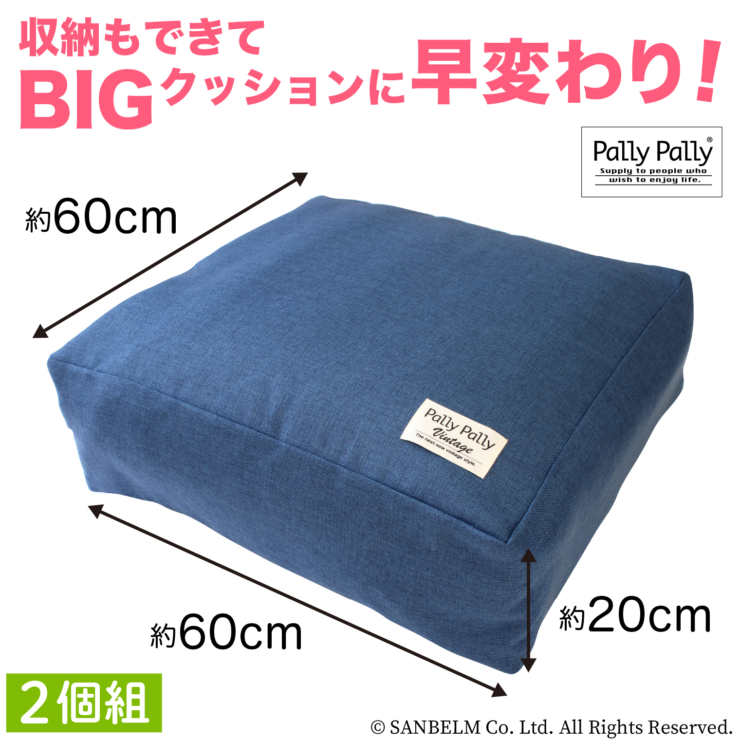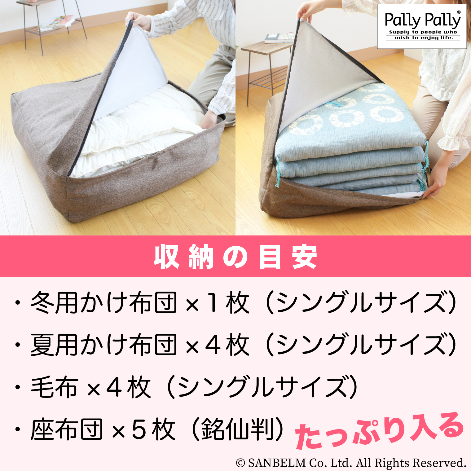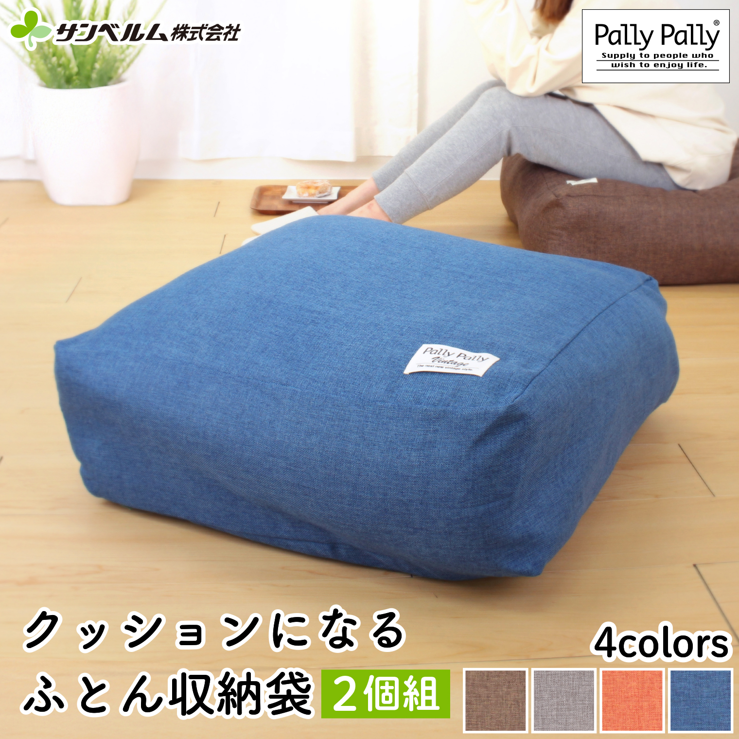 収納用品 パリーパリー アイデア PallyPally かけ布団がクッションになる ふとん収納袋(2個組)5,500円(税込) 商品のご購入は下記「楽天市場」公式ストアよりお願いいたします。 https://item.rakuten.co.jp/sanbelm-shop/tu1860/ Tweet 申し訳ございませんが、只今品切れ中です。 支払い方法について|配送・送料について|返品について 商品情報 品名 PallyPally かけ布団がクッションになる ふとん収納袋(2個組) 材質 ポリエステル サイズ 約(W)60×(D)60×(H)20cm (ふとん収納時) 品番 TU1860 入数 2